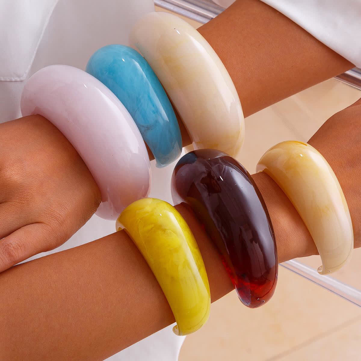 Podkreśl swój styl tą jaskrawożółtą bransoletką. Wykonana z wysokiej jakości, niemetalowej podstawy, bransoletka ta została zaprojektowana tak, aby stanowić śmiały akcent. Jej gładkie wykończenie i przyciągający wzrok odcień tworzą wyjątkowy i nowoczesny dodatek, który idealnie doda koloru każdej stylizacji.