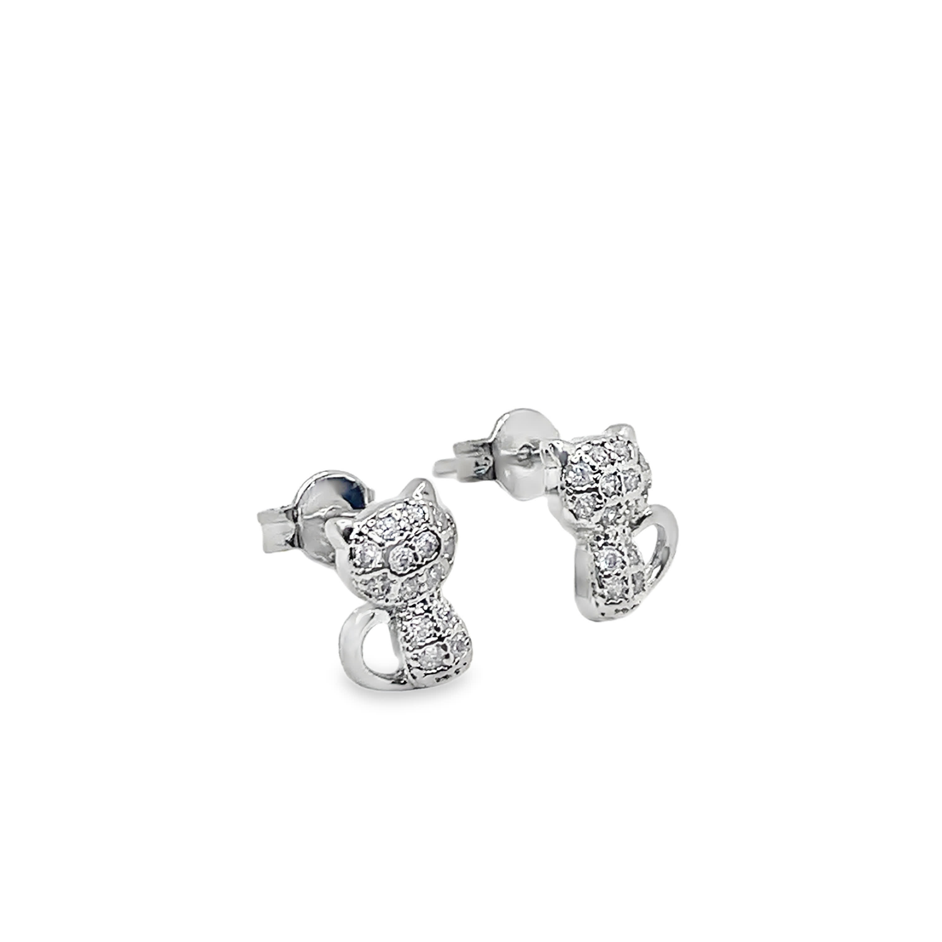 Exquisite stud earrings crafted in lustrous white gold plated silver. These charming earrings feature a playful kitty design, adorned with meticulously set round cut colorless diamonds. The diamonds are of VS1 clarity, G color grade, exhibit a brilliant cutting style, excellent polish, and symmetry that capture and reflect light with every movement.