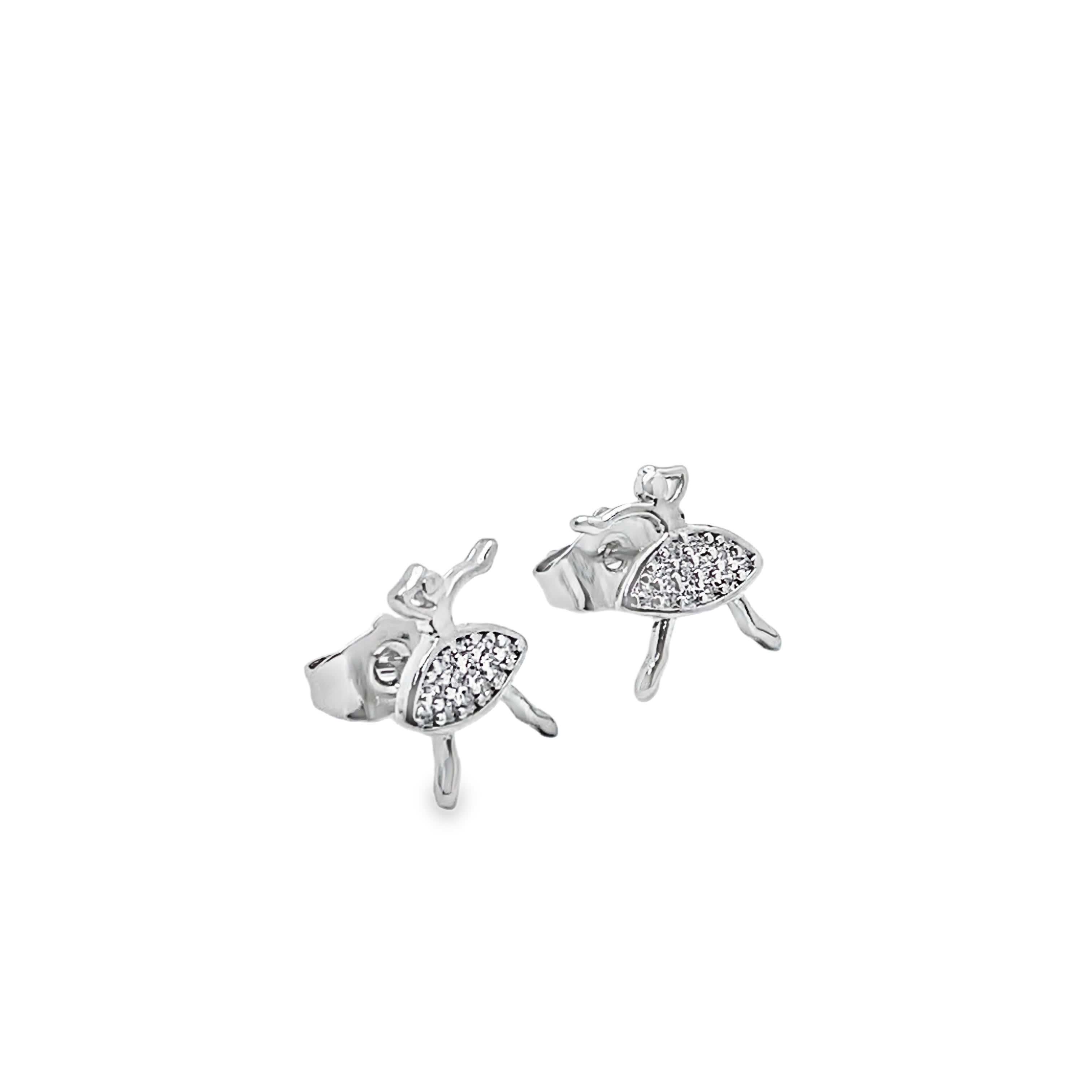 Elevate your style with these charming ballerina stud earrings. Crafted in lustrous white gold plated silver, each earring features a round brilliant cut diamond embellishment, adding a touch of sparkle and elegance to the playful design. These earrings are perfect for adding a whimsical and sophisticated accent to any ensemble.