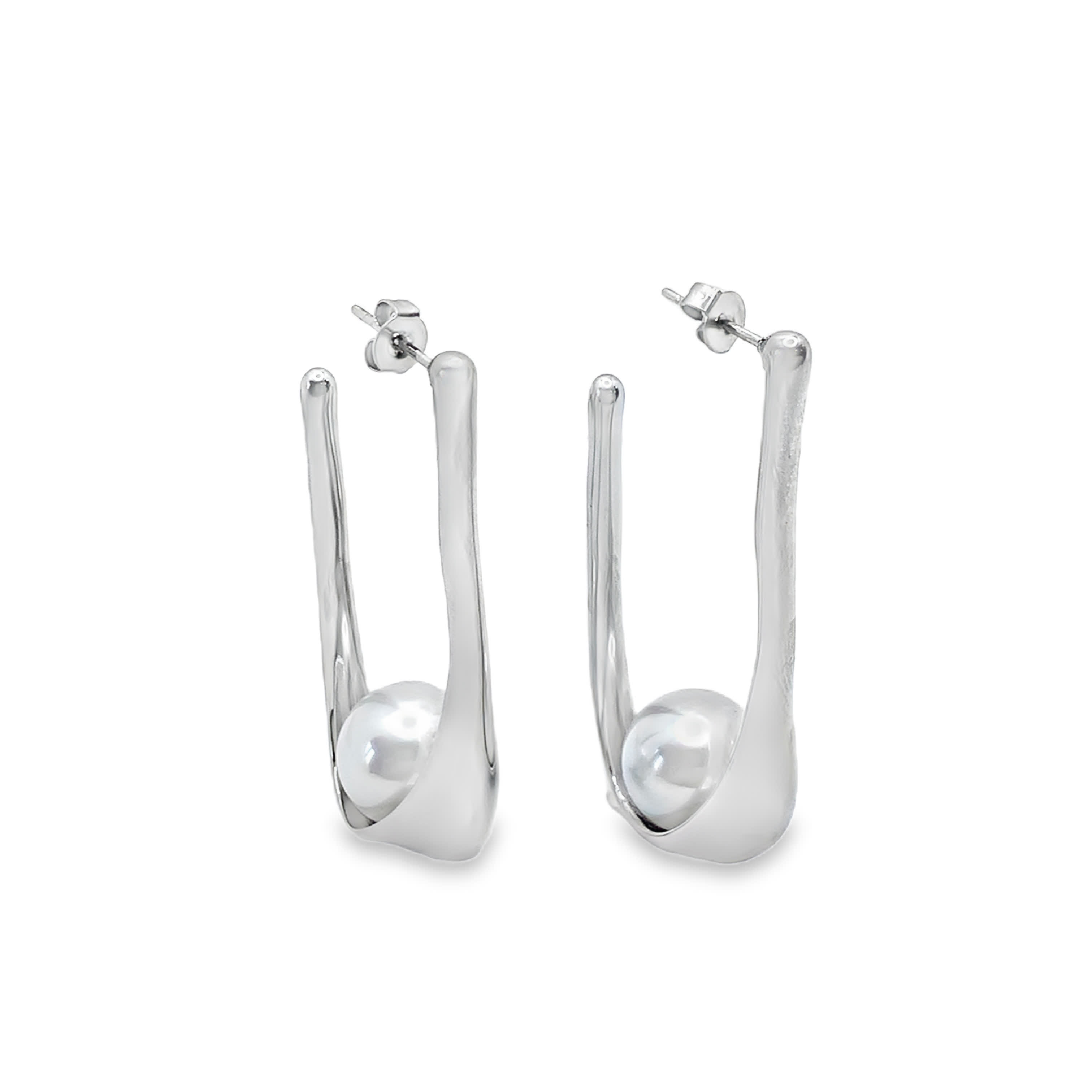 Elevate your style with these contemporary hoop earrings. Crafted from lustrous white gold plated silver, they feature smooth, round pearls in a classic cabochon cut. These elegant earrings offer a modern twist on a timeless design.