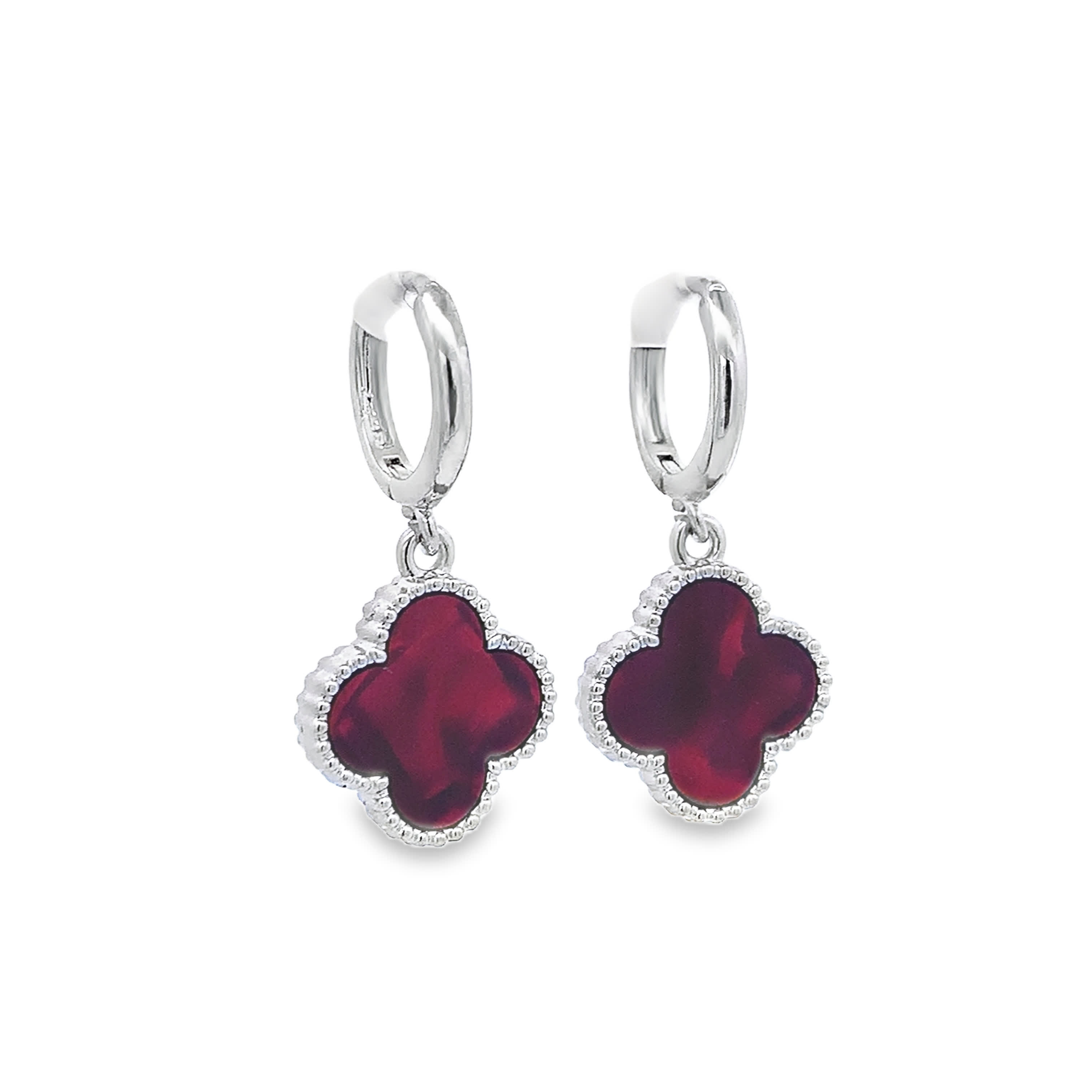 Elegantly designed dangle earrings featuring clover shaped cabochon rubies, bezel-set in sterling silver with white gold plating. These earrings offer a touch of sophistication with a secure latch-back closure, making them perfect for daily wear or special occasions. The deep red hue and smooth finish of the rubies create a luxurious, timeless look.
