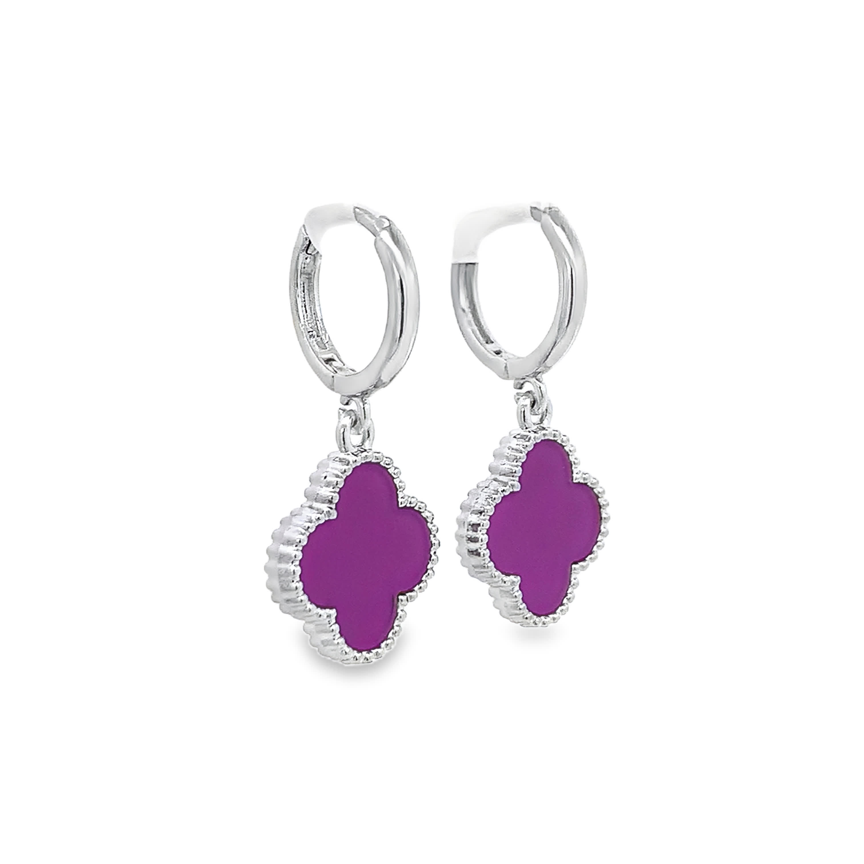 Elevate your style with these chic dangle earrings crafted from lustrous white gold plated silver. They feature captivating clover-shaped, vivid purple quartz cabochons. Their high clarity quartz and graceful silhouette add a touch of playful elegance to any ensemble.