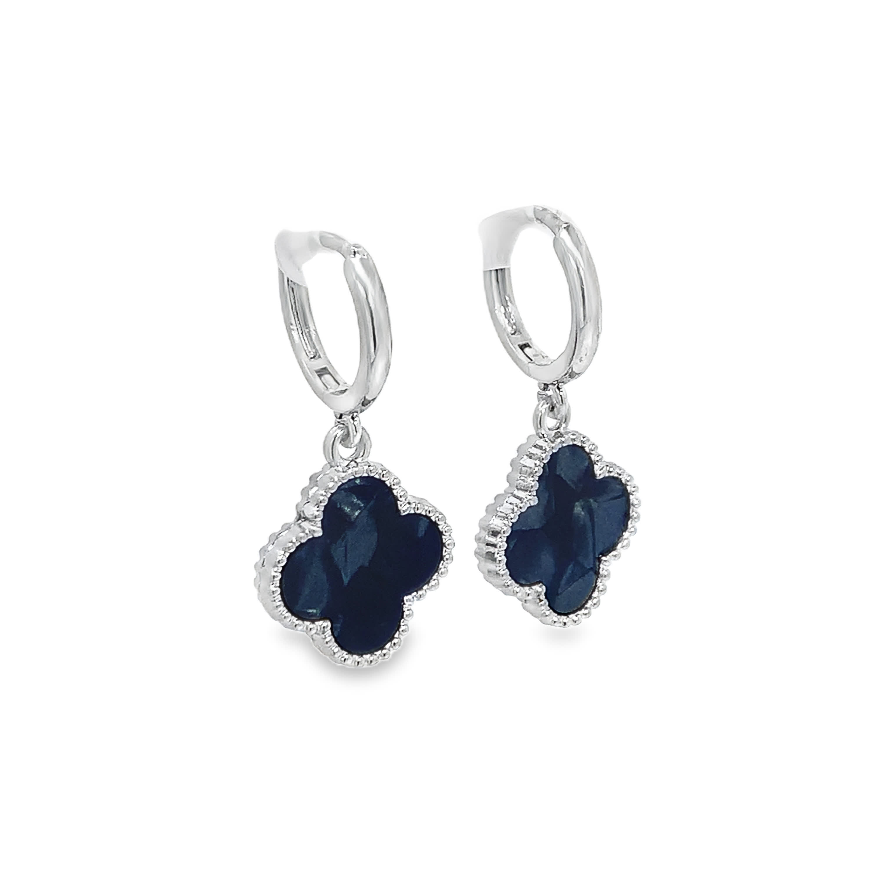 Elevate your ensemble with these exquisite dangle earrings, meticulously crafted from sterling silver. Each earring features a round cabochon-cut onyx gemstone, exhibiting a deep blue hue. The four leaf clover design adds a touch of refined elegance, making them a perfect accessory for both formal and everyday wear.