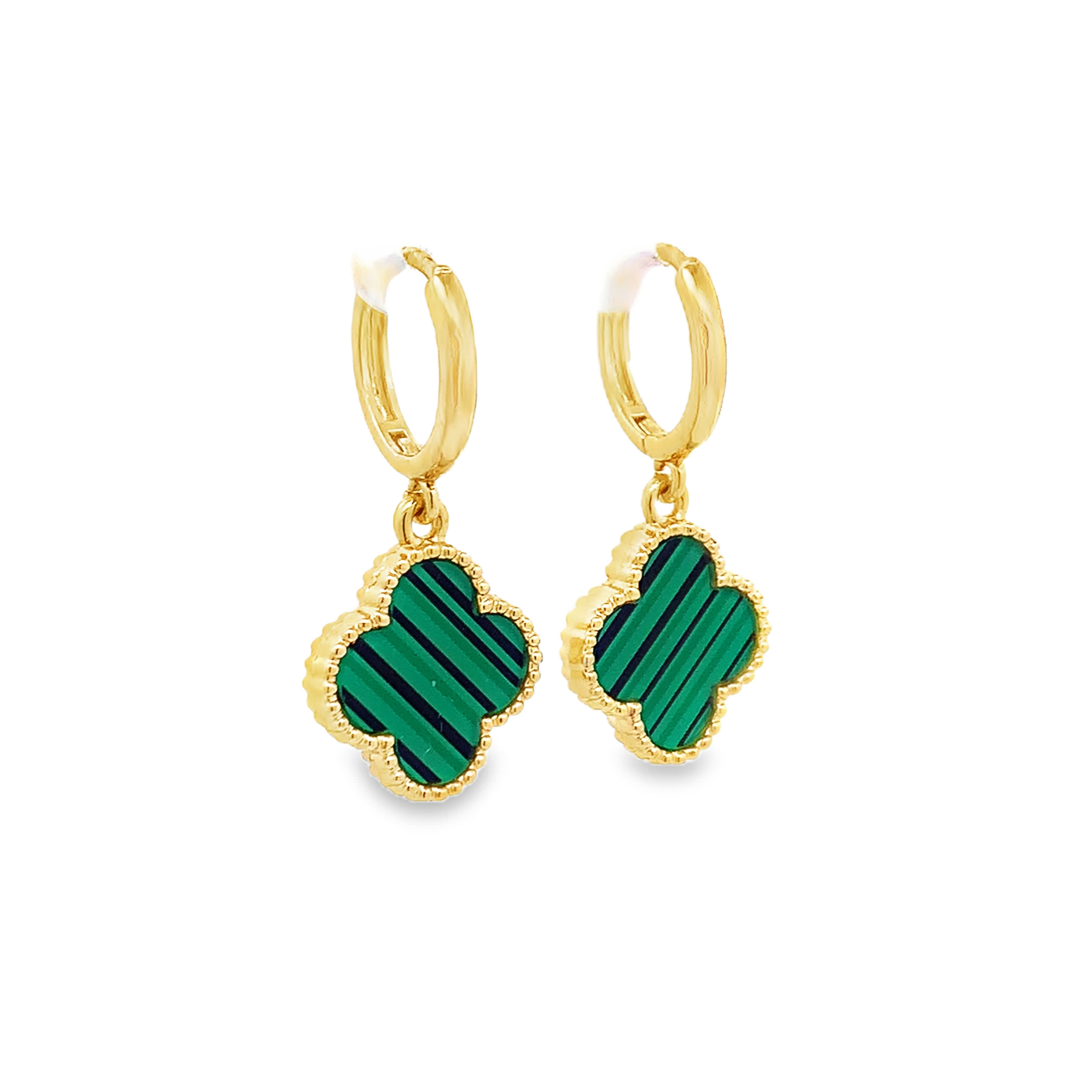 Elevate your style with these charming dangle earrings, crafted in radiant yellow gold. Each earring features a round cabochon-cut malachite gemstone, showcasing captivating green hues and unique striped patterns. A beautiful blend of elegance and natural beauty, these earrings are perfect for adding a touch of sophistication to any ensemble.