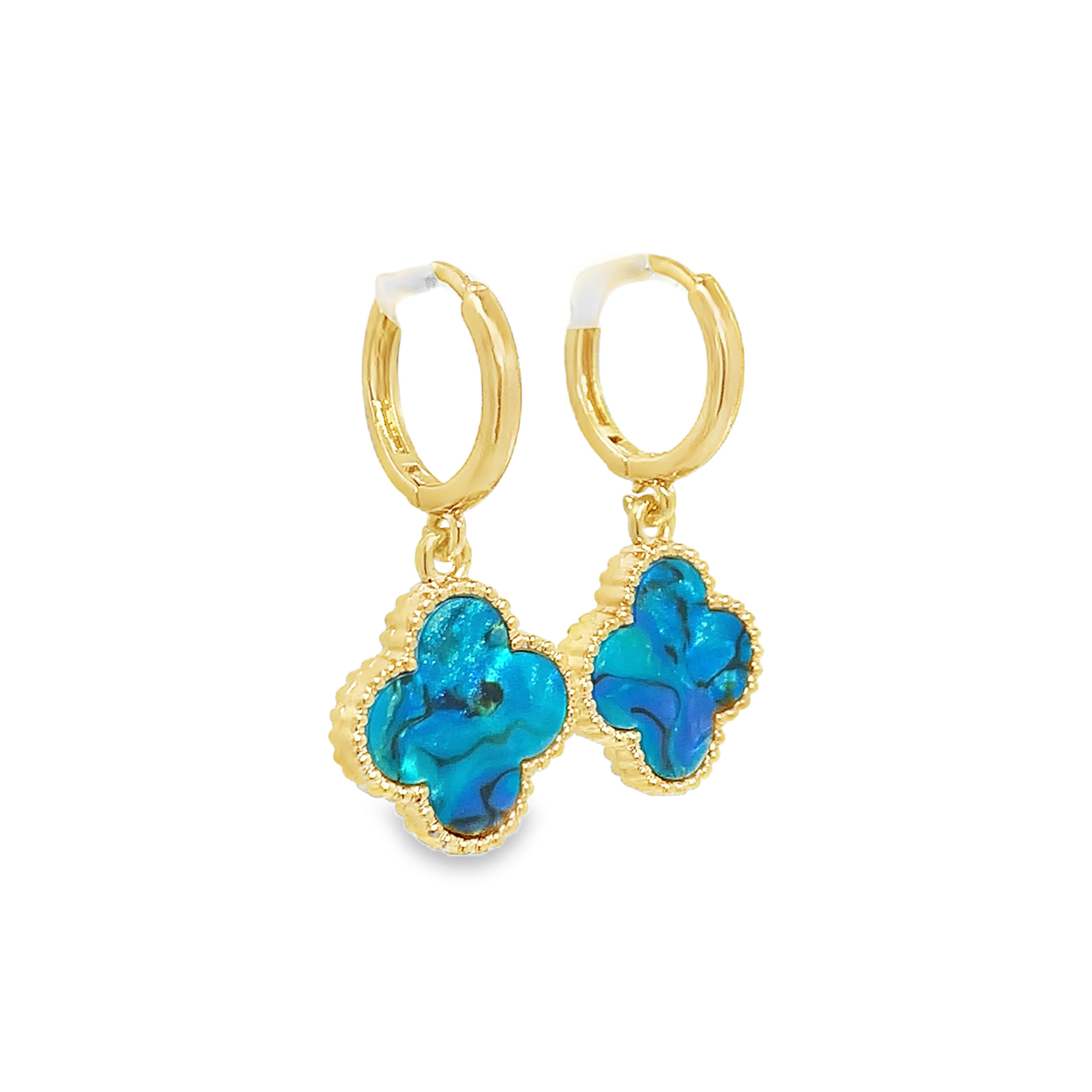 Kolczyki wiszące z metalu w kolorze żółtym z turkusowymi kamieniami i motywem koniczynki