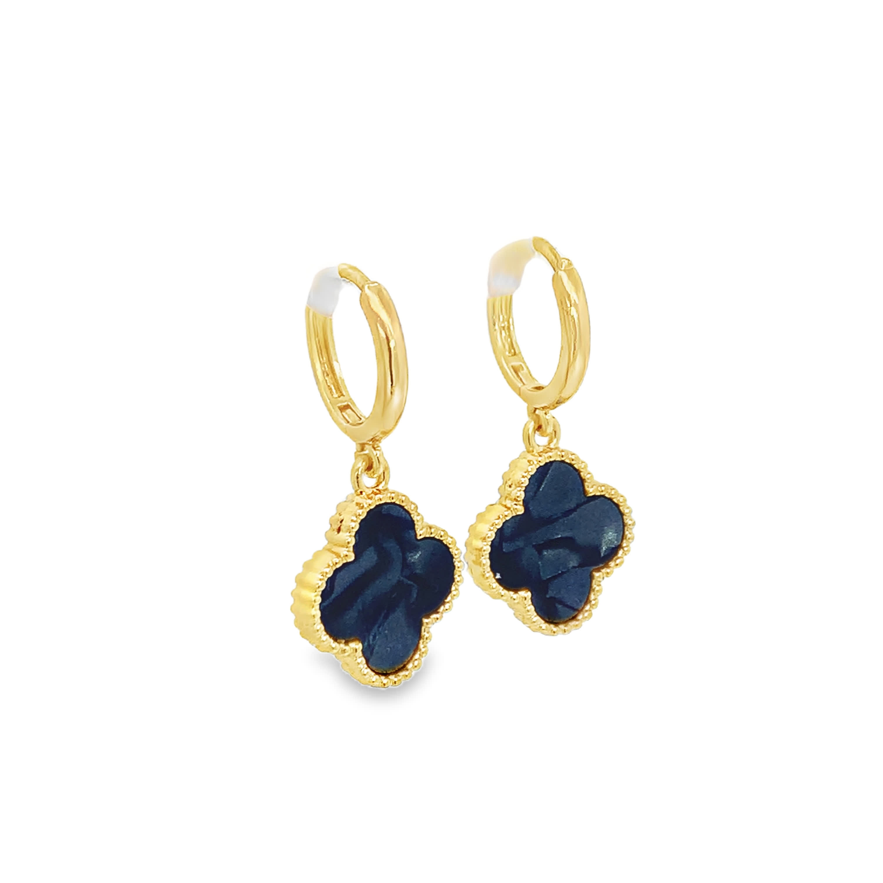 Elevate your ensemble with these exquisite dangle earrings, featuring captivating round cabochon onyx stones set in a four-leaf clover design. The deep blue hue of the onyx is beautifully complemented by the warm glow of the yellow gold base material. These earrings exude sophistication and timeless elegance, making them a perfect addition to any jewelry collection.