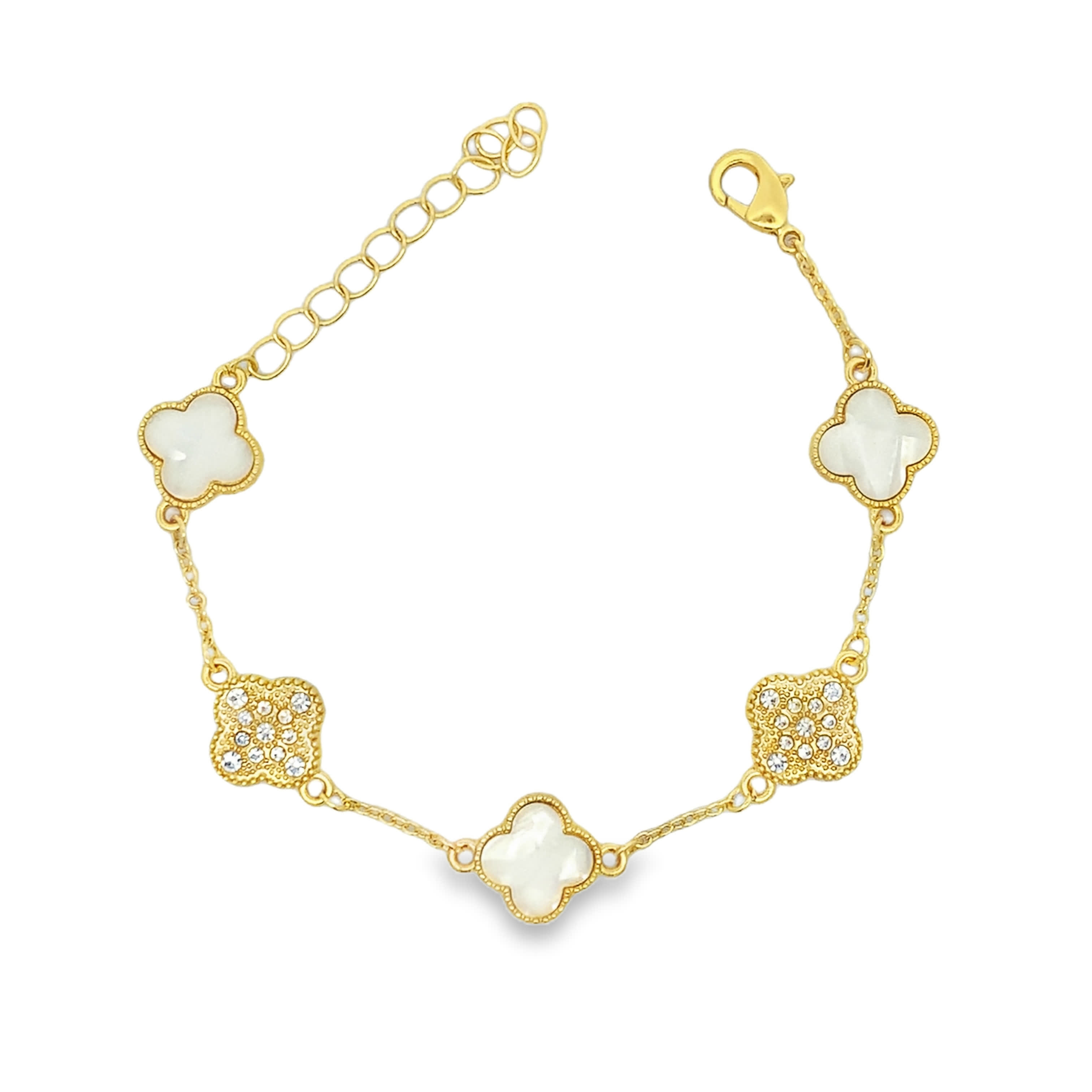 Embrace refined elegance with this exquisite yellow gold chain bracelet. This delicate piece features alternating quatrefoil motifs, some inlaid with shimmering crystals, others with lustrous white inlays. This bracelet is a testament to subtle luxury, perfect for adding a touch of sophistication to any ensemble.