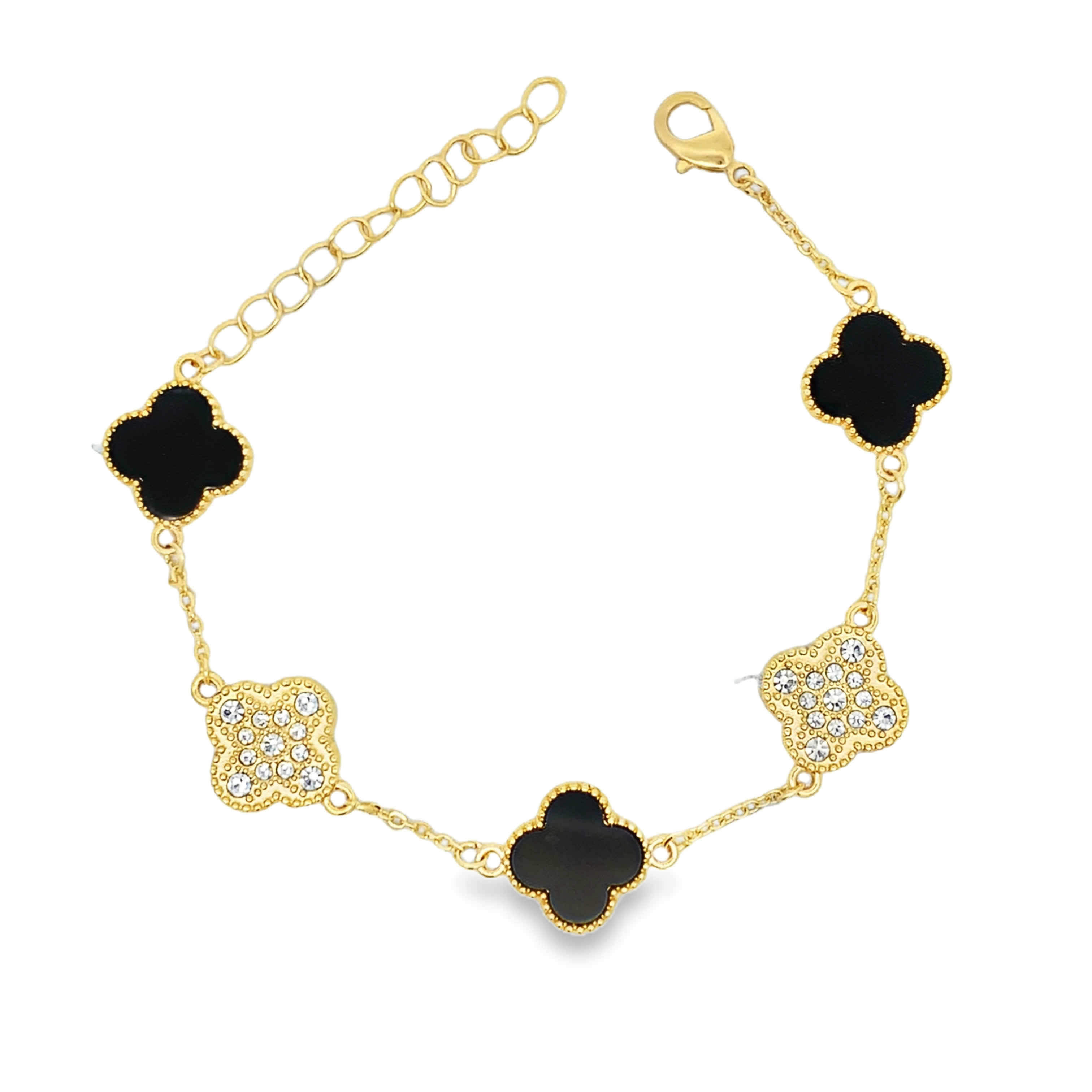 Elevate your style with this charming yellow gold chain bracelet. Featuring alternating clover motifs, some adorned with sparkling accents and others with sleek black inlays, this delicate bracelet adds a touch of playful elegance to any ensemble. Perfect for both everyday wear and special occasions.