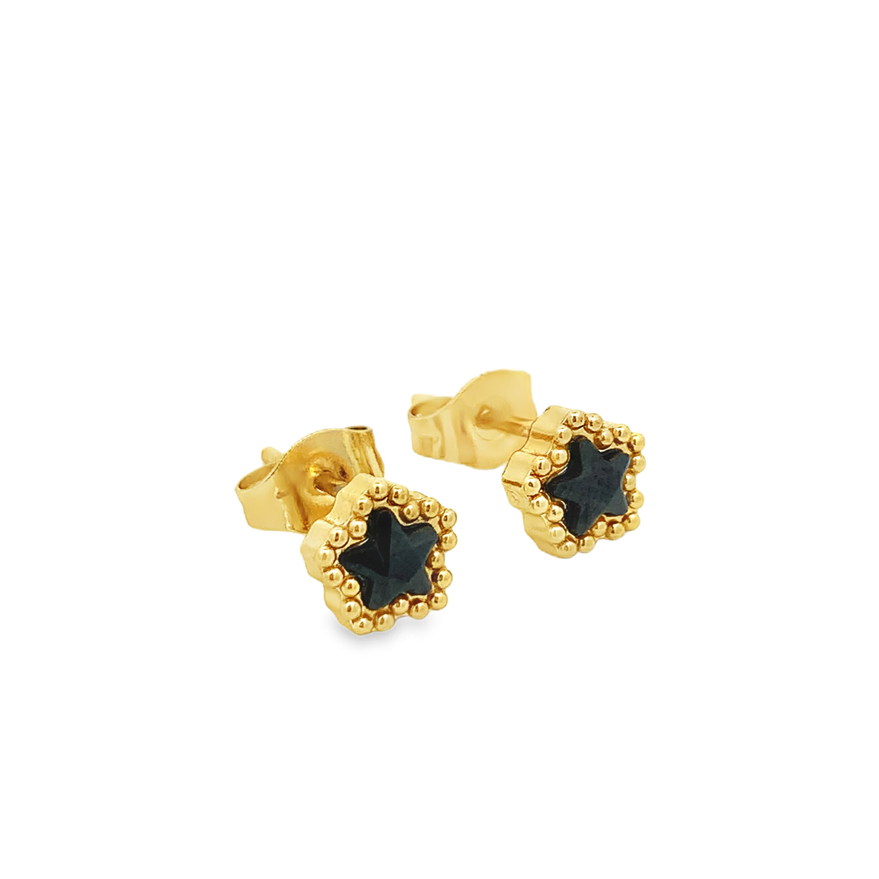 Adorn your ears with these captivating stud earrings, featuring star-shaped cabochon onyx gemstones. Set in warm yellow gold, these earrings offer a touch of celestial charm and understated elegance. The star design is emphasized by gold beaded perimeter creating perfect symmetry. These onyx earrings are a simple and elegant addition to elevate any outfit.