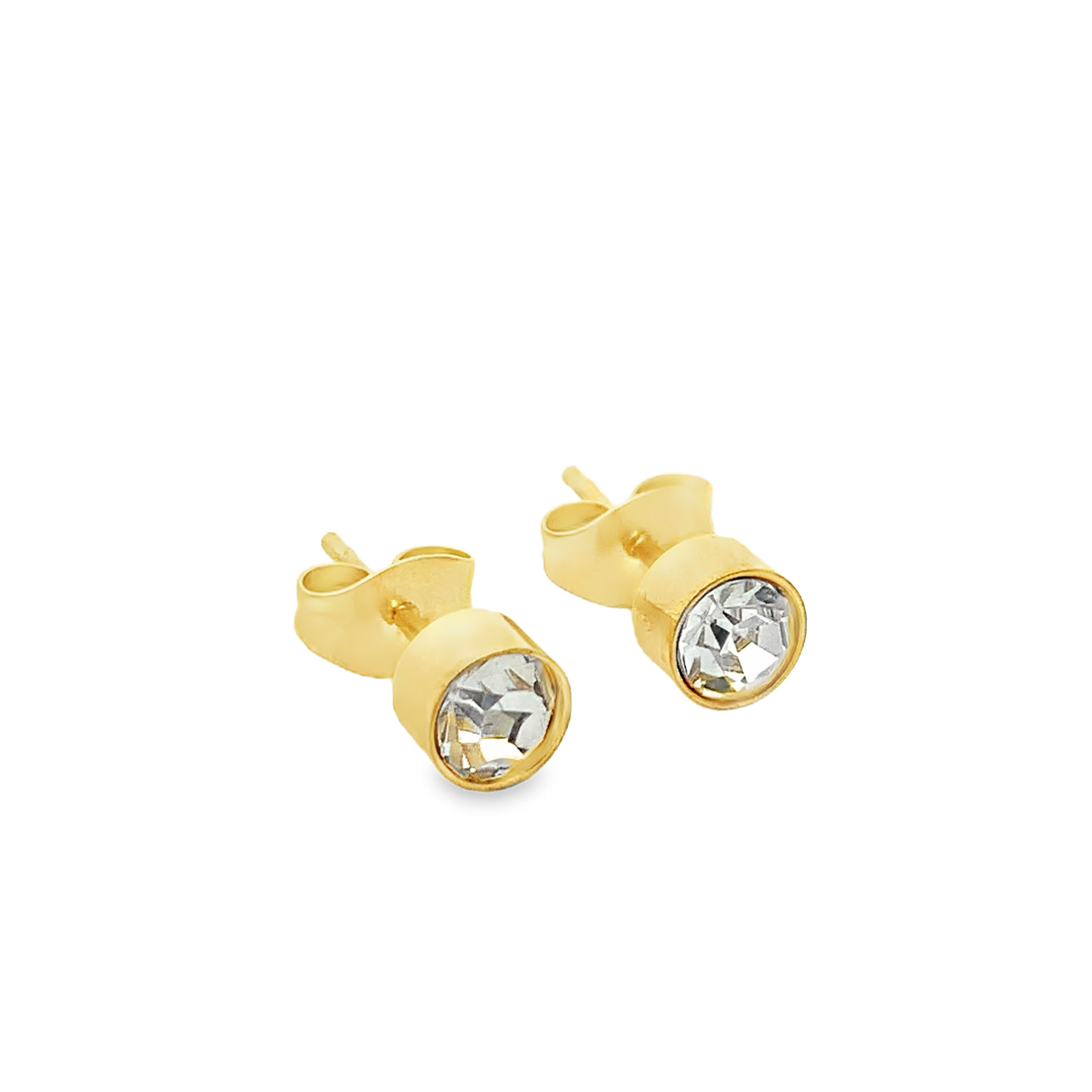 Elevate your everyday style with these minimalist stud earrings, crafted from radiant yellow gold. Each earring features a round cut crystal, secured in a bezel setting. These timeless earrings offer understated elegance and subtle sparkle for any occasion.