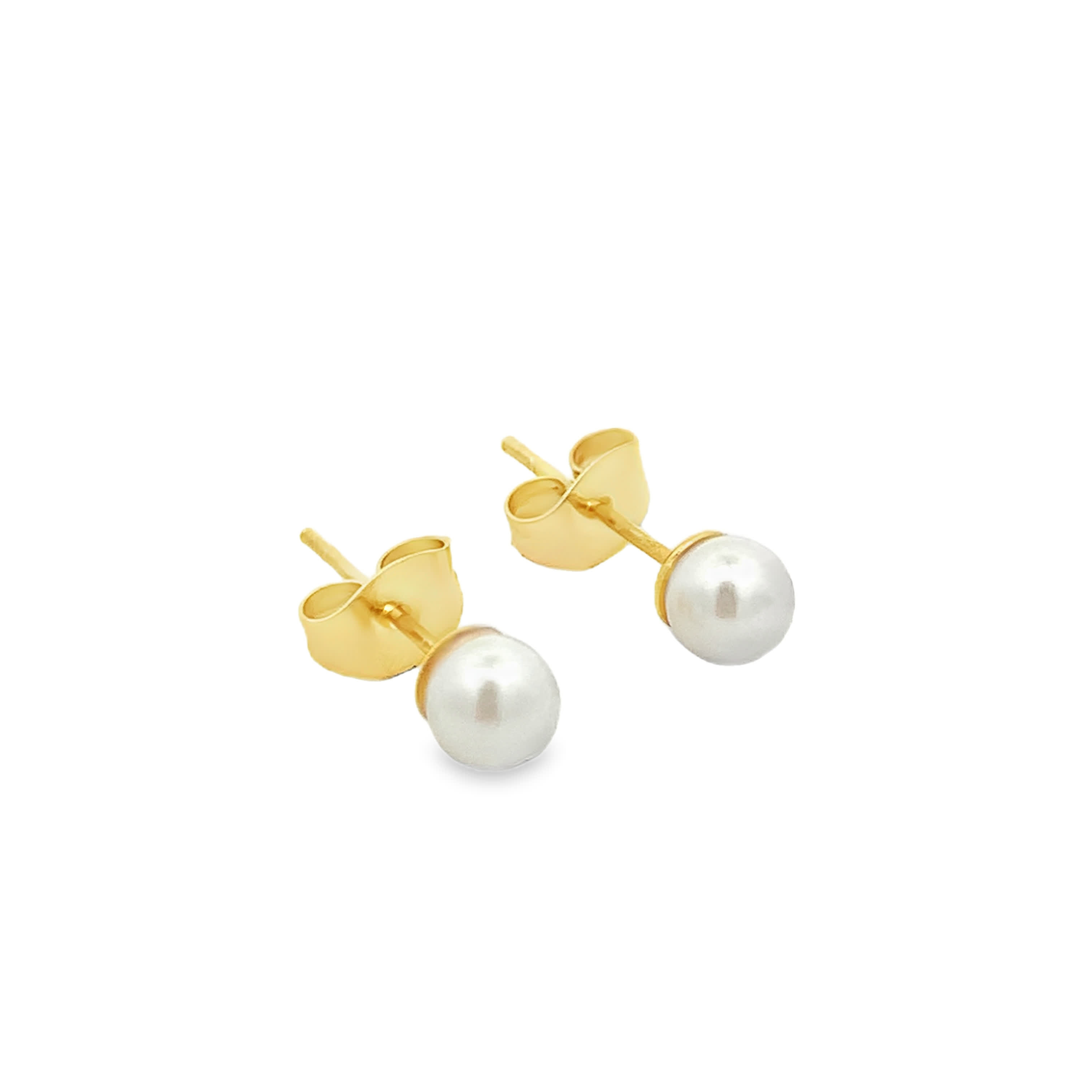 Elevate your style with these classic stud earrings. Crafted in radiant yellow gold, they showcase lustrous round pearls. Their cabochon cut highlights the pearl\\\'s smooth surface. These versatile earrings bring a touch of timeless elegance to any outfit.